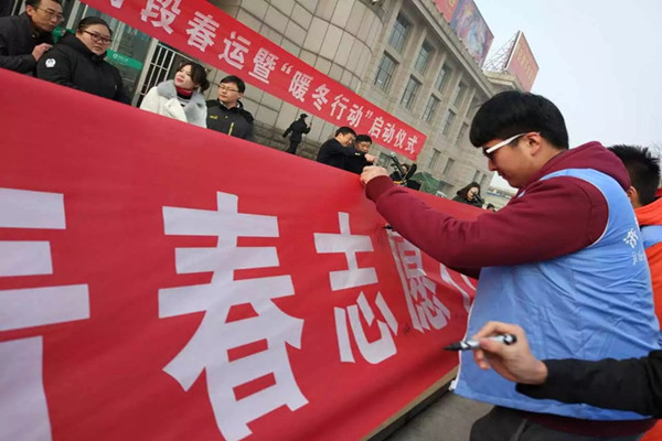 1月13日,2017年铁路春运暨青年志愿服务“暖冬行动”启动仪式在泰山火车站举行。由我校青年志愿者和部分泰山站铁路职工组建的志愿服务队共同宣誓志愿服务精神,一起在印有服务承诺的条幅上郑重签下名字。