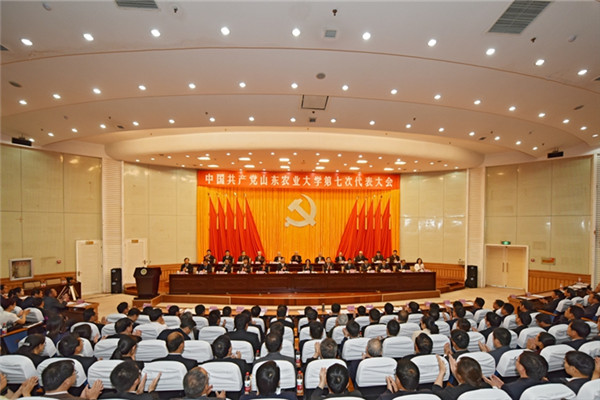 主席台上方悬挂着“中国共产党山东农业大学第七次代表大会”大幅会标,十面鲜艳的红旗簇拥着党徽。大会主题是:高举中国特色社会主义伟大旗帜,以马列主义、毛泽东思想、邓小平理论、“三个代表”重要思想和科学发展观为指导,全面贯彻党的十八大和十八届历次全会精神,深入学习贯彻习近平总书记系列重要讲话精神和治国理政新理念新思想新战略,全面从严治党,坚持立德树人,抢抓发展机遇,深化综合改革,提高办学质量,继往开来,创新发展,为建设优势突出、特色鲜明、国际知名的高水平大学而努力奋斗。