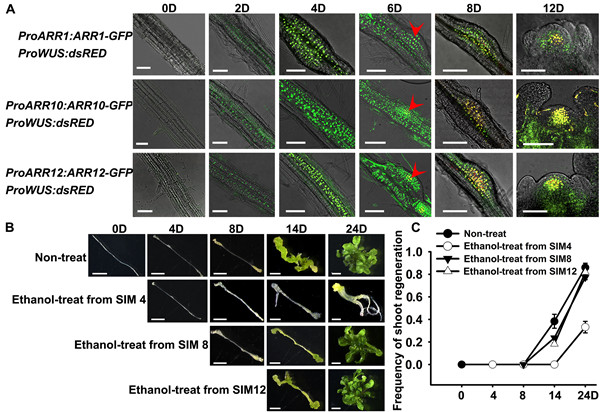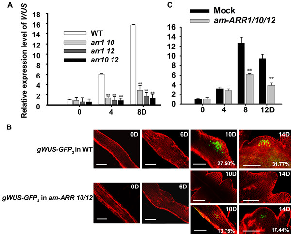 细胞生物学和遗传学的手段证明细胞分裂素响应调节因子ARRs直接调控干细胞决定基因WUSCHEL的表达