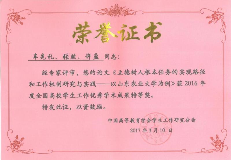 在中国高等教育学会学生工作研究分会开展的全国高校学生工作优秀学术成果评选中,我校选送的5篇论文获奖。其中,《立德树人根本任务的实现路径和工作机制研究与实践——以山东农业大学为例》(作者车先礼)获特等奖,《“6+1”辅导员队伍精培工作法的实践探索——以山东农业大学为例》(作者朱莉)、《“四五三五”:辅导员队伍建设的模式创新》(作者吴衍涛)获一等奖,《论深度辅导在高校学生工作中的应用》(作者李涛)、《大学生的情感风险及其可控路径》(作者王斐)获二等奖。